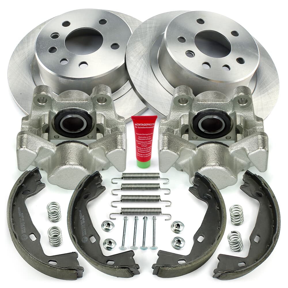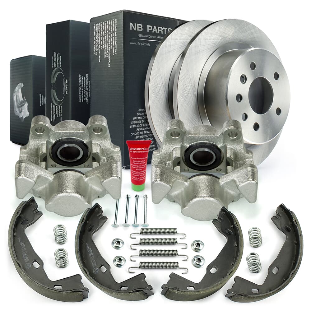 NB PARTS Bremsscheiben + Bremssättel + Bremsbacken + Zubehörsatz radseitig