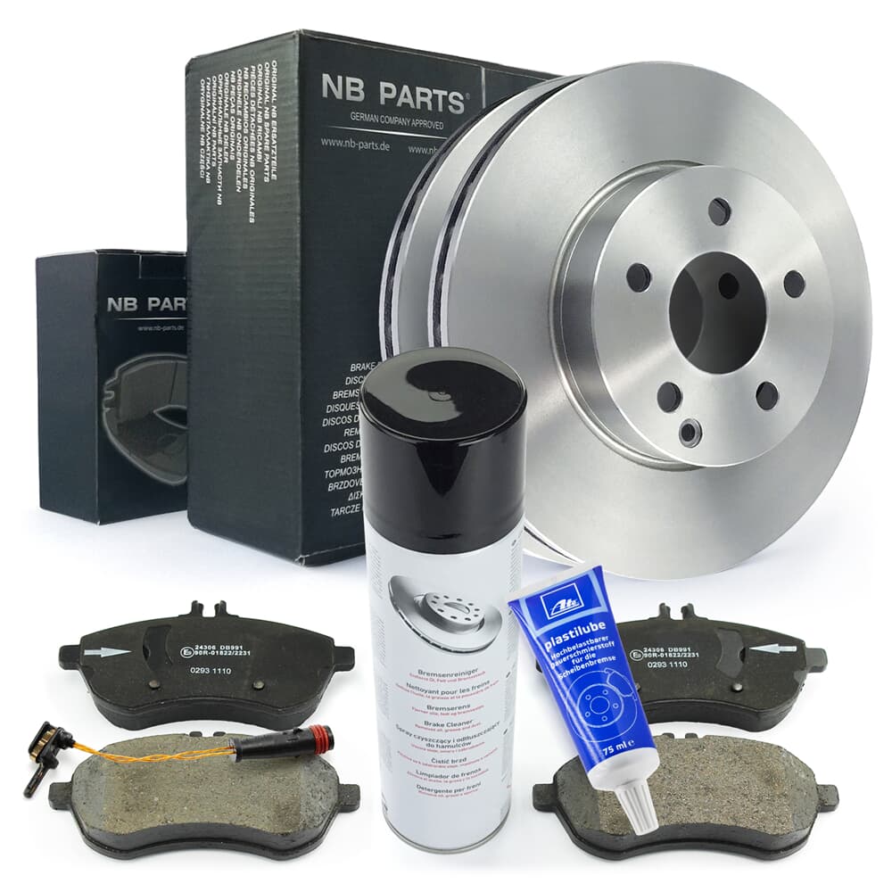 NB PARTS remschijven + remblokken + waarschuwingscontact + remmenreiniger + Plastilube voor
